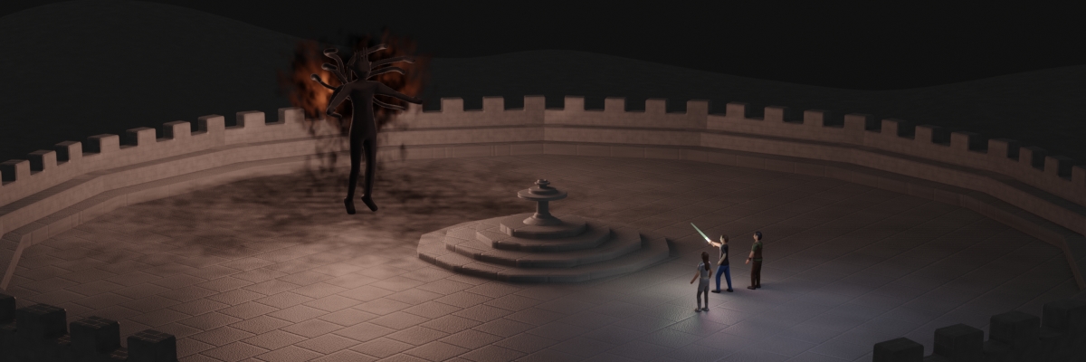 David and his companions approached the altar. He noticed a slot in its centre. He took the sword and slid it into place. A shaft of bright white light shone down from the sky and a bubble expanded outward from the altar. The cannon fire from the towers below intensified and the demons surrounding the city were forced to retreat.