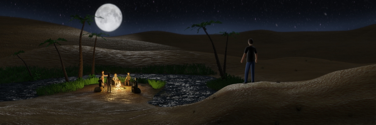 Sometime later, David crested a hill and found himself at an oasis, where a group of adventurers sat around a campfire. Their leader, a pale young man with short, black curly hair, wearing the leather armour of a rogue, greeted him and invited him to join them. They ate and drank, chatted and joked, and David found his morale boosted.